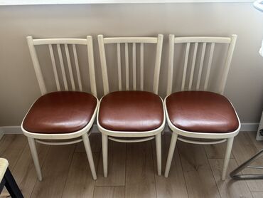 - 3 деревянных стула в одном стиле: каркас светлый (близко к молочному/слоновая кость), спинка с вертикальными рейками, сиденье мягкое с коричневой кожзам‑обивкой. Подходят для кухни или столовой, смотрятся как набор.