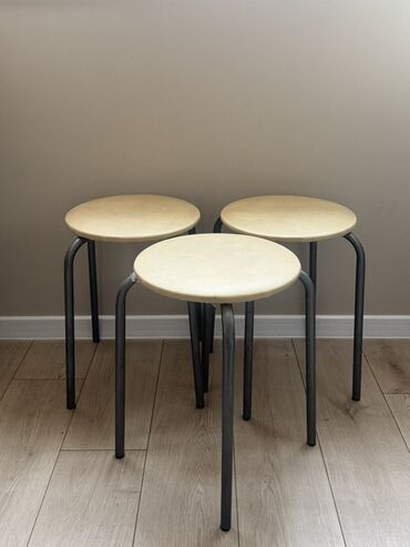 - 3 круглых табурета: сиденье светло‑бежевое, металлические ножки темно‑серого цвета. Компактные, устойчивые, удобны как запасные места для гостей или для кухни.
