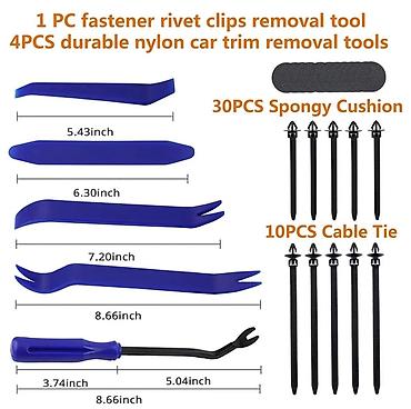 - 45 доп. аксессуаров и инструментов: пластиковые лопатки/съемники обшивки, монтажные стяжки, резиновые кольца, клипсосъемник-«вилка», отвертка-рычаг, разметочные колпачки и пр.