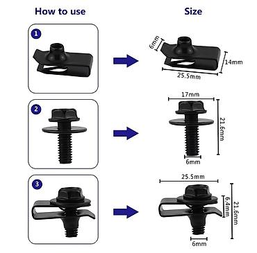 - Пошаговая инструкция установки некоторых клипс с указанием размеров 6–25,5 мм — на иллюстрации.