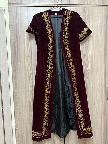 - Бордовая бархатная накидка/чапан длины миди-макси с короткими рукавами. Открытая спереди без застежек, внутренняя подкладка темного цвета. По бортам, рукавам и низу — золотистая вышивка с национальными узорами. 500 сом 44-46 размер