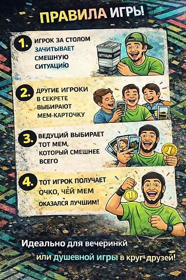 Игра с мемами и ситуациями, где нужно подбирать самые смешные и подходящие ответы. Отлично поднимает настроение и делает любую встречу максимально весёлой!