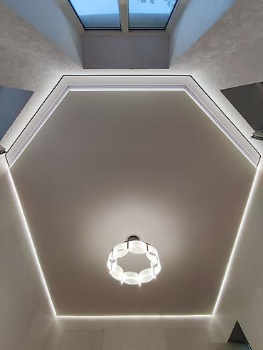 Натяжные потолки с интегрированным освещением - Современные потолочные решения: парящие контуры, скрытые теневые профили, ровные полотна без видимых соединений. - Встроенные световые линии и тре...