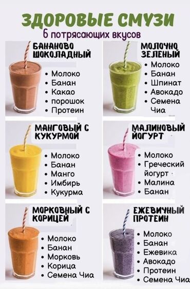 2) Молочно‑зелёный: молоко, банан, шпинат, авокадо, семена чиа.
