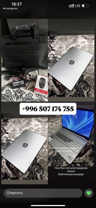 Подойдёт для учёбы, офиса, путешествий: всё нужное для работы в комплекте — сумка, зарядное, мышь. Стильный тонкий корпус HP, классический серебристый цвет.