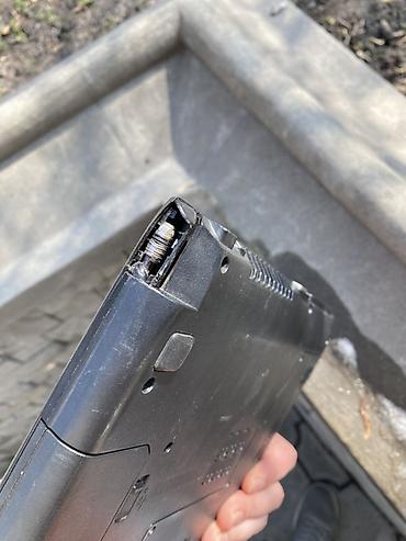 - Повреждение в области левой петли: раскрыт угол корпуса, видны элементы механизма петли.