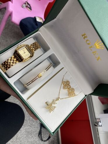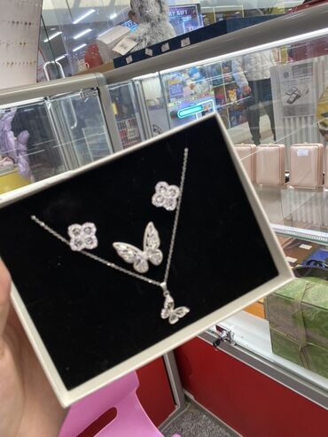 Элегантный набор женских украшений, включающий часы, браслет, серьги, колье и кольцо. Все предметы выполнены в серебристом цвете с декоративными камнями, придающими блеск. Часы имеют квадратный циферблат и металлический ремешок, инкрустированный камнями. Браслет тонкий, также украшен камнями. Серьги и подвеска на колье представляют собой квадратные элементы с центральным камнем. Кольцо выполнено в аналогичном стиле. Набор идеально подходит для создания законченного образа, а также в качестве подарка.