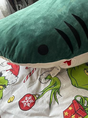 - Формат: плюшевая акула с «пастью»-капюшоном. Внутри — красная мягкая подкладка, по краю — треугольные «зубы».