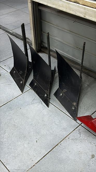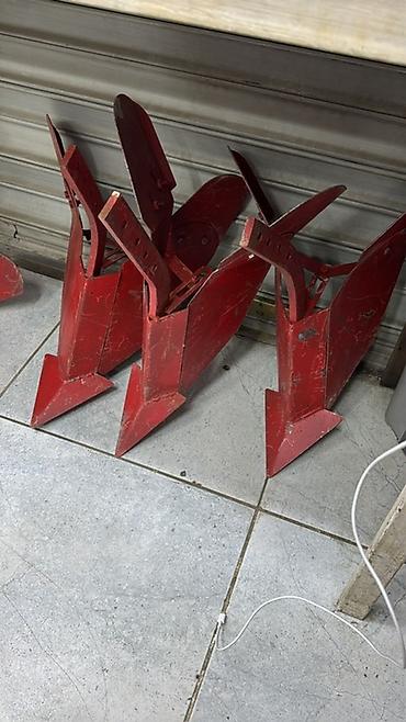 - Комплект навесных орудий для обработки междурядий: черные — односторонние отвал-окучники, красные — стрельчатые окучники с регулируемыми стойками.