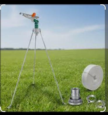 Комплектация на фото может включать треногу/штатив, рукав (ленточный шланг) и переходные кольца/адаптеры для подключения к системе полива.
