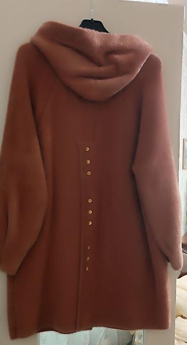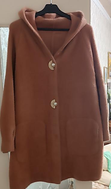 Пальто с капюшоном, карамельно-терракотового оттенка. Мягкий ворсистый материал с эффектом «мохер/альпака», тактильно пушистый и тёплый. Свободный прямой крой до колена, рукав втачной.