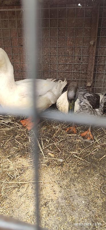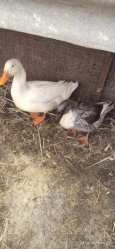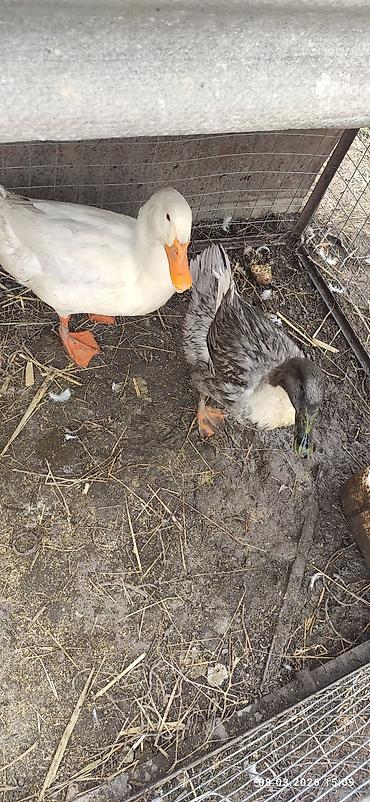 - Описание: на фото пара уток — одна белая с оранжевым клювом и лапами, вторая серо-пестрая с темной головой и белой грудкой. Содержатся в вольере на подстилке из сена/соломы.