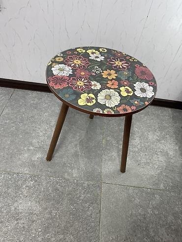 - Круглая столешница с ярким цветочным рисунком на темном фоне: ромашки, георгины и другие цветы в теплой гамме (белый, желтый, оранжевый, бордовый).