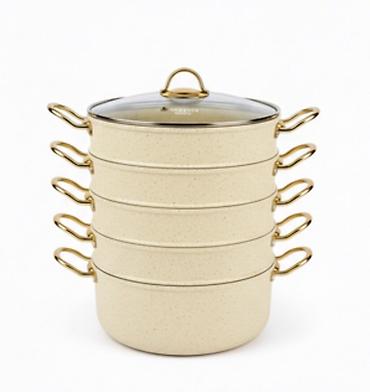 - Комплектация: кастрюля-основание 8,0 л + 4 яруса по 4,5 л, стеклянная крышка с пароотводом.