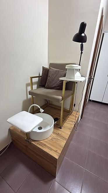 - Подиум из ЛДСП под дерево с встроенной раковиной-чашей для педикюра и сливом.