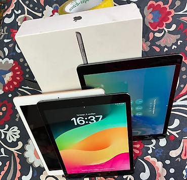 Apple iPad — комплект из нескольких планшетов с кнопкой Home и Touch ID. На фото представлены модели с разными цветами корпусов (чёрный/серый и белый/золотистый) и рамками экрана. Экран 9,7–, IPS Retina, поддержка мультитач. На дисплеях видны актуальные версии iPadOS с русской локализацией; устройства проходят блокировку экрана паролем. Есть фирменная коробка Apple.