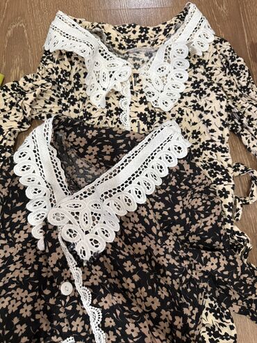 Подборка женской и мужской одежды и обуви с указанием размеров и цен. Женская коллекция (размер 42–44): - Платье в горошек, миди, приталенный силуэт, короткие рукава-фонарики. Цена 800 сом. - Беже...