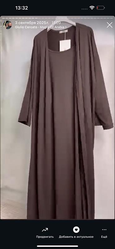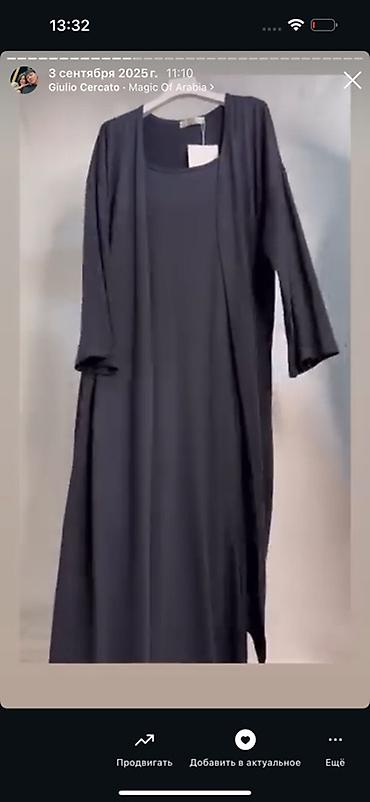 - Длина макси, свободно струящийся силуэт, круглая горловина у платья, широкий рукав у накидки.