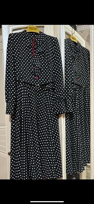 Платье в горошек, черное с белыми точками. Свободный силуэт миди с