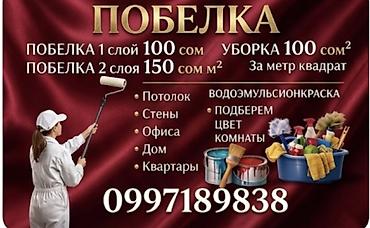 Услуги побелки и уборки - Побелка стен/потолков: • 1 слой — 100 сом • 2 слоя — 150 сом - Уборка после выполненных работ — бесплатно - Генеральная уборка после ремонта — 100 сом/м² Аккуратное ...