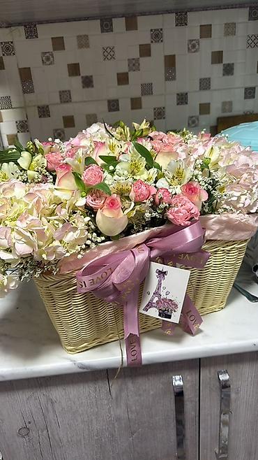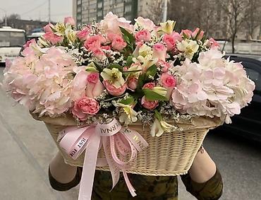 - Уход: держать в прохладе, опрыскивать гортензию водой; оазис внутри корзины поддерживает свежесть — периодически добавлять немного воды по центру между цветами.