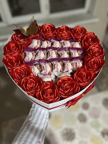- Коробки и корзинки с конфетами Raffaello, декорированные искусственными атласными розами. Доступны круглые и сердцевидные коробки, а также вариант с бортом из шоколадных батончиков и бантом.