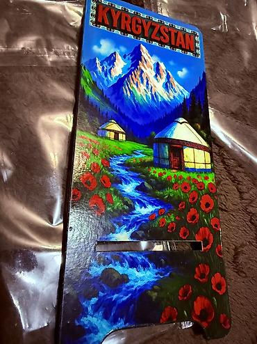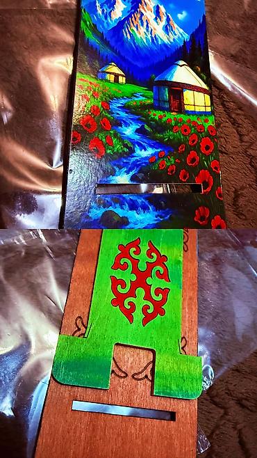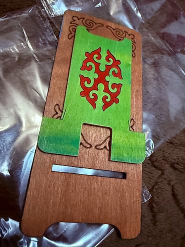 Подставка для смартфона/планшета из дерева с национальным дизайном Кыргызстана.