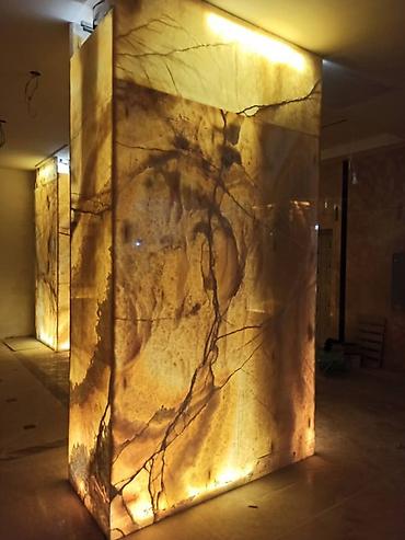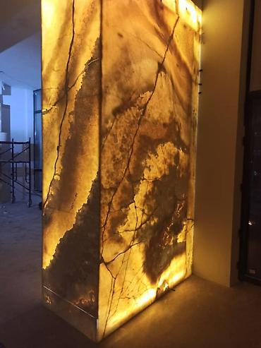 Подсвечиваемые панели из натурального оникса для облицовки колонн, стен и интерьерных акцентов.