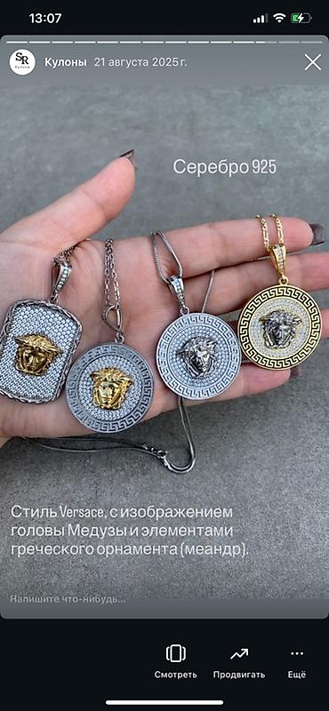 - Стиль Versace — круглые и прямоугольные подвески с изображением головы Медузы и греческим меандром. Серебро 925.