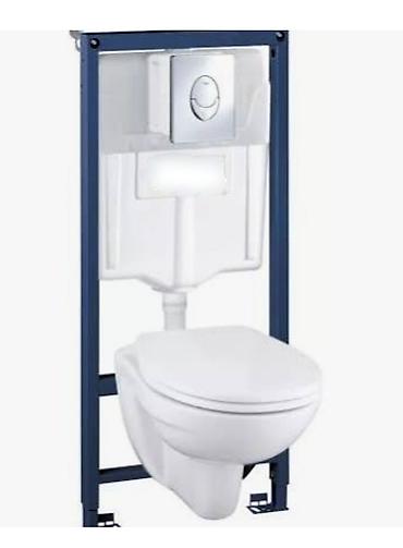 - Комплект: металлическая монтажная рама, скрытый сливной бачок, подвесной фарфоровый унитаз с сиденьем/крышкой, клавиша смыва.