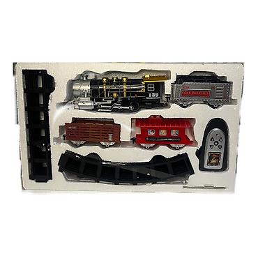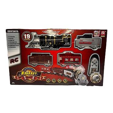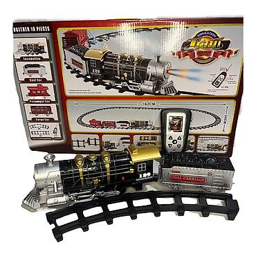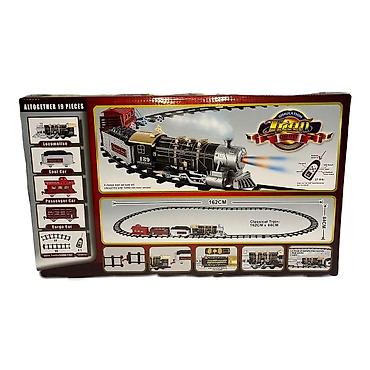 В набор входит 18 деталей. Два варианта сборки железной дороги: круглая или овальная Общая протяженность дороги 388см, размер 162х84см. Состав состоит из локомотива, пассажирского вагона, грузового состава и вагона с углем. При запуске у поезда загорается прожектор, идет дым и начинают воспроизводиться звуковые эффекты. Работает от 4х батареек типа АА, в комплект не входят.
