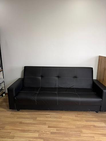 Диван-кровать в современном стиле - Прямой трехместный диван с широкими подлокотниками - Обивка: черная экокожа с декоративной прострочкой и мягкой каретной стяжкой на спинке и сиденье - Практичны...