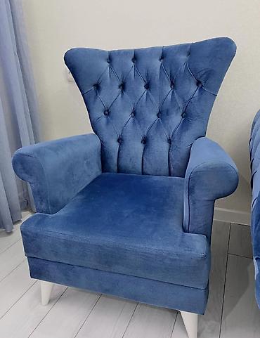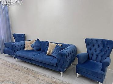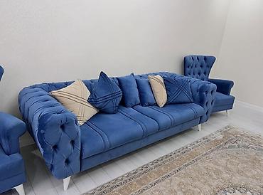 Диваны прямые, 3‑местные, со спинкой средней высоты и широкими подлокотниками. Несколько вариантов обивки и дизайна: - Однотонная микрофибра/велюр: синий, серо‑синий, светло‑голубой. Стежка на спин...