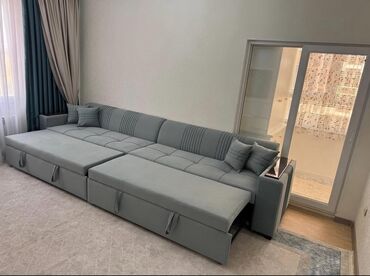 - Формат: очень длинный прямой диван с тремя выкатными модулями, превращается в широкую кровать. Каждый модуль раскладывается отдельно — можно использовать частично или полностью.