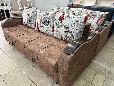 - Подушки: 3 большие съемные подушки с принтом (городские мотивы), на молниях — удобно стирать чехлы и регулировать наполненность.