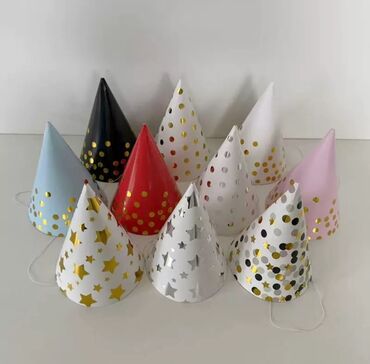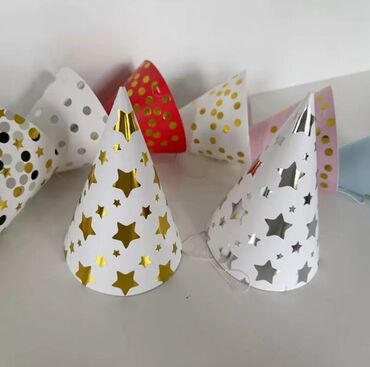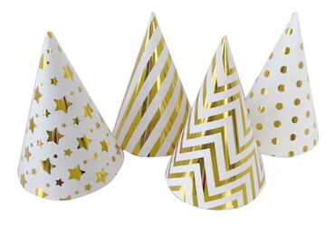 - Материал: плотный картон с глянцевой фольгированной печатью (золотые звёзды, горох, полосы, зигзаг).