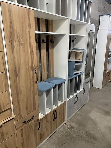 - Комплект: высокая панель с 4–5 крючками для одежды, открытая верхняя полка для головных уборов, тумба с выдвижным ящиком, шкафчик с дверцей, скамья-место для сидения с нижними отделениями/тумбами, вертикальное зеркало.