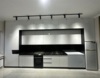 Торговый модуль для магазина/салона - Комплект из секций: нижние тумбы с распашными фасадами под «черный мрамор», верхние открытые полки/ниши. - Две высокие стойки-дисплея со стеклянными полками: ...