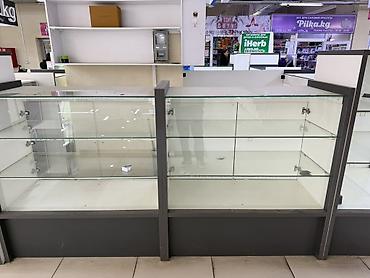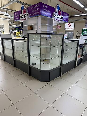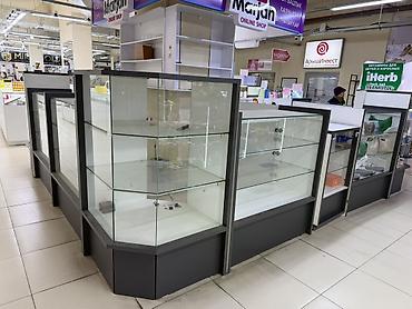 Торговое оборудование для магазина Состав: - Прямые и угловые стеклянные витрины на белых тумбах. Верхние стеклянные панели, внутренняя полка, розетки/подводка под подсветку внутри. - Настенные ст...