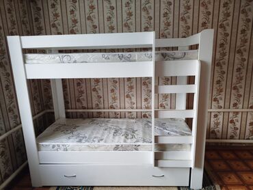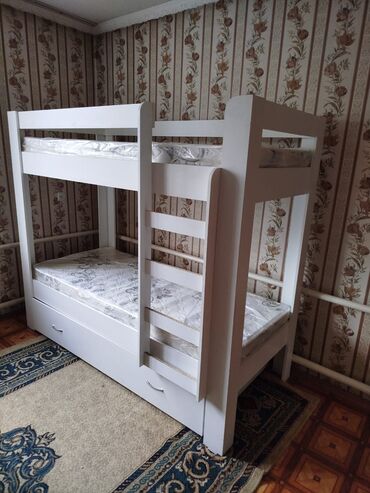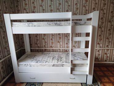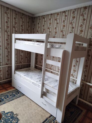 Двухъярусная кровать белого цвета с вертикальной лестницей и ящиками для хранения. Эта функциональная кровать подходит для детских комнат, эффективно используя пространство за счет двух спальных ме...