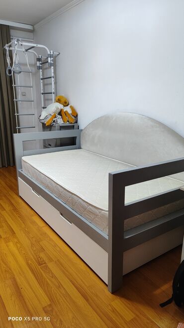 Односпальная кровать с матрасом. - Конструкция: деревянное основание, снизу усилена металлическим каркасом и плитой ДСП толщиной 18 мм. - Выдерживаемая нагрузка: до 150 кг и выше. - Подходит для д...