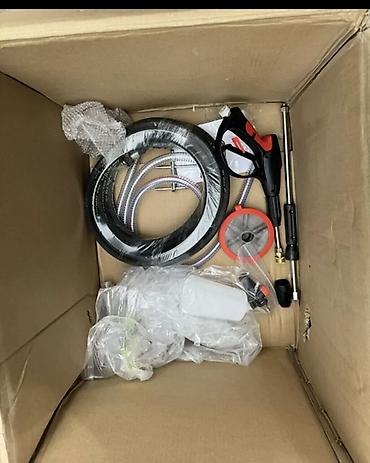 Комплект на фото: мойка SEMPROX SWP3001, пистолет, удлинитель, набор форсунок, шланги (напорный и заборный) с фильтром, пенокомплект, аксессуары и крепеж.