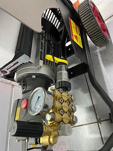 - Электрическая напольная мойка высокого давления на тележке с большими колёсами для удобной перевозки.