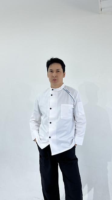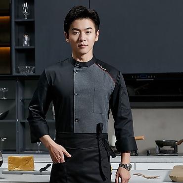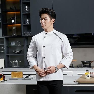 - Куртка шеф‑повара с воротником-стойкой и асимметричной застёжкой на пуговицы. Рукав 3/4, нагрудный карман, декоративная контрастная вставка/кант. Модели в двух вариантах: чёрно‑серый и белый.