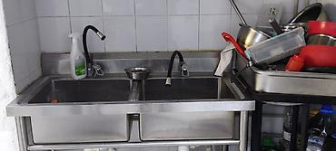 - Двухсекционная мойка из нержавеющей стали с бортом и сливной чашей-приемником, смесители на каждую ванну, нижняя полка/рама для устойчивости.