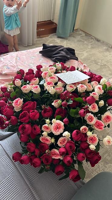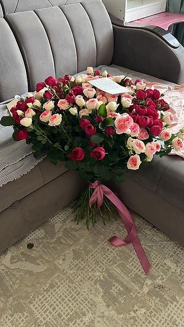 - Оформление: густая шапка из сотен бутонов на длинных стеблях, декоративная зелень, атласная лента в тон. Внутри — открытка для личного послания.