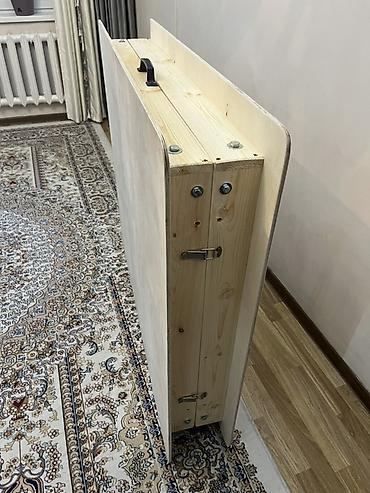 - Конструкция книжка: основание состоит из двух створок на мощных петлях, внутри — ниши для хранения всех ножек и крепежа.