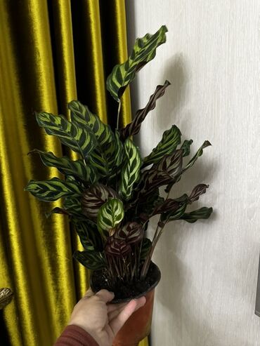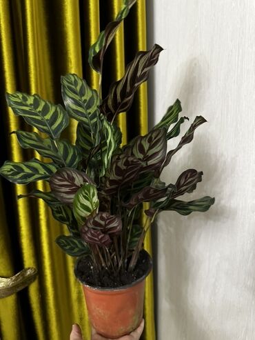 САТЫЛАТ 🌿 Калатея (Prayer Plant) Бою: 45–50 см Баасы: 500 с Үйдү көрккө бөлөп туруучу, кооз жалбырактуу декоративдик өсүмдүк. Жарыкты жакшы көрөт, түз күн тийбеген жерге коюлат. Кам көрүү жеңил.