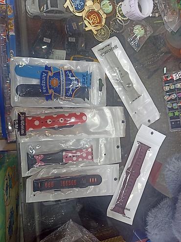 - Силиконовые ремешки с классической застёжкой, разные расцветки: бордовый, чёрный с красными вставками, серый, яркие тематические принты (в т.ч. в горошек). Указаны варианты для 38/40 мм.