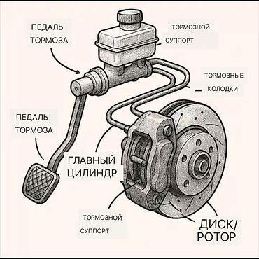 - Ремонт тормозной системы: диски/роторы, колодки, суппорты, шланги, главный цилиндр, прокачка тормозов
